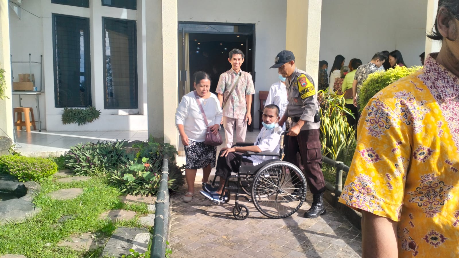 Pelayanan terbaik itu dilakukan oleh Bripka Hari Subagyo yang dengan suka rela mendorong kursi roda kakek lansia.