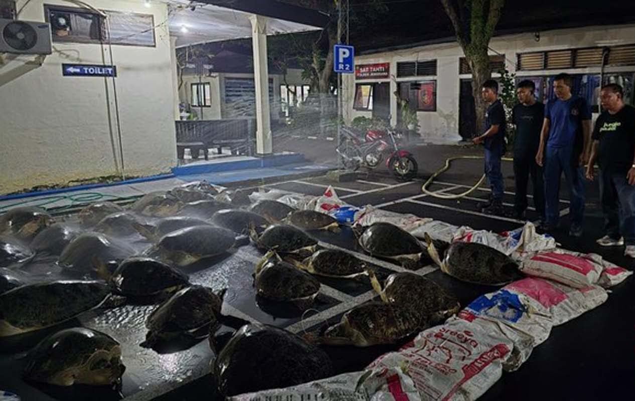 Puluhan satwa dilindungi itu ditemukan dalam keadaan hidup dengan kondisi terikat dan ditutup karung berwarna cokelat. Diduga penyu-penyu tersebut akan diselundupkan ke Pulau Bali.