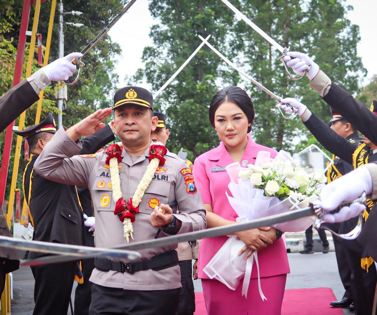 Sebagai bentuk penyambutan, ia menerima kalungan bunga dan disuguhi tarian khas sebelum melewati gerbang kehormatan Pedang Pora. Prosesi ini dilakukan oleh para perwira yang berbaris dengan pedang terhunus membentuk gapura, menciptakan suasana penuh kehormatan saat Kapolres baru memasuki markas kepolisian.