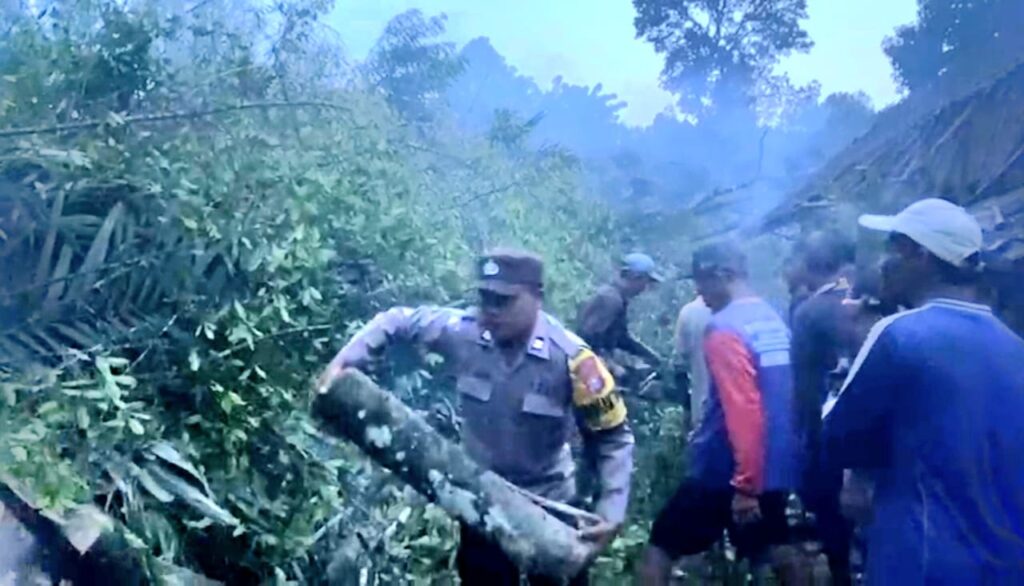 Tampak petugas TNI – Polri bersama dengan warga memotong pohon yang menghalangi jalan, membantu rumah warga yang tertimpa pohon.